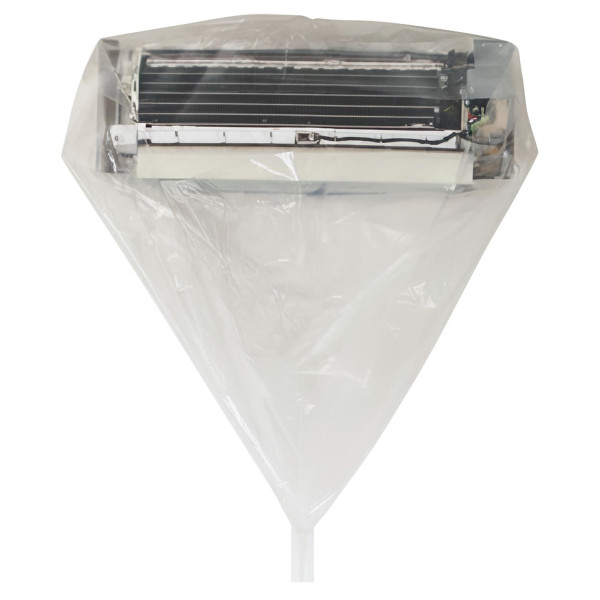 Protective Cleaning Cover: Designed for wall mounted air conditioners from 1.5 to 3 tons, from 18,000 to 36,000 Btu and circumference up to 11 ft 10 in. Prevents wall and floor splashes while cleaning, with convex shape and bottom drain that keeps the area dry and clean.
