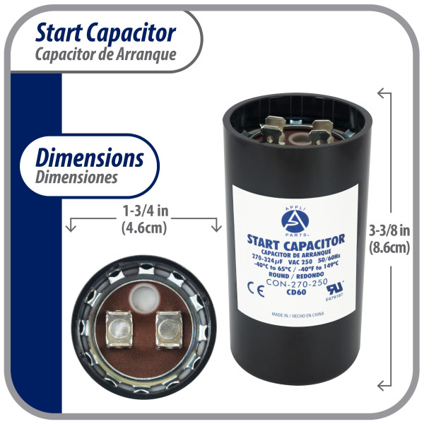 Appli Parts CON-270-250 Capacitor de Arranque 270-324 MFD (microfaradios) uF, 250 VAC. Universal para Motores Electricos, condensador de arranque de 4.6 cm de Diametro, 8.6 cm de Alto