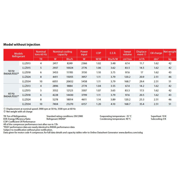 Danfoss LLZ018T2LQ9C 6 HP LBP Compresor Scroll para Refrigeracion 208-230/3/60 (V/Ph/Hz) R404A, R507, R452A, R448A, R449A, Conexion Rotolock, 121L9548, 121L9549, 121L9511, 121L9510, 121L9057