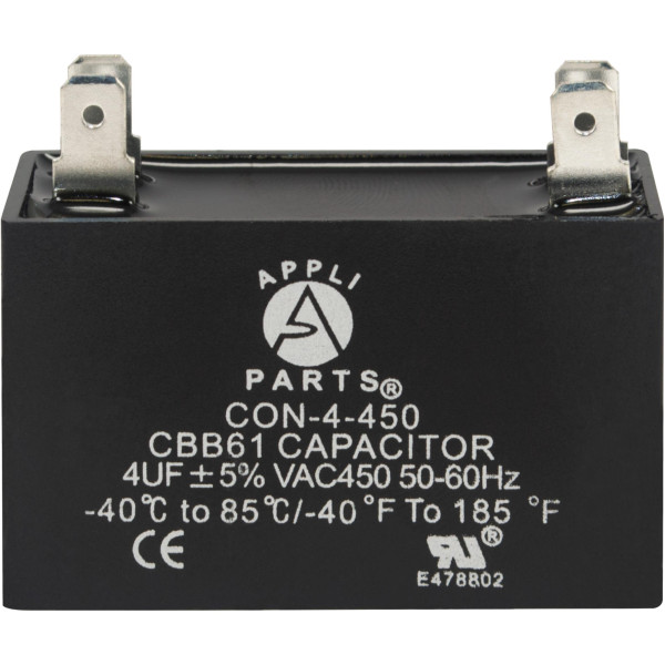 Appli Parts CAP-4-450 Fan Capacitor 4 mfd (microfarads) uf 450 VAC with 4 Terrminal Connections compatible with any brand within the same range of capacitance 1-7/8in Width 3/4in Depth 1-1/2in Height
