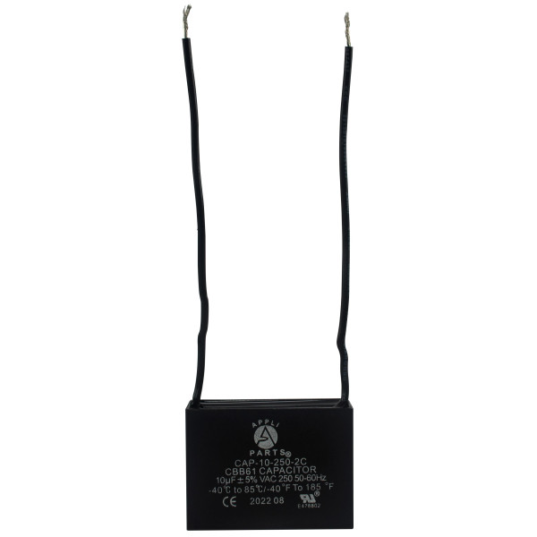 Appli Parts CAP-10-250-2C Fan Capacitor 10 mfd (microfarads) uf 250 VAC with 2 Wire Terminal Connections compatible with any brand with same capacitance 1-7/8in Width 1in depth 1-1/2in Height