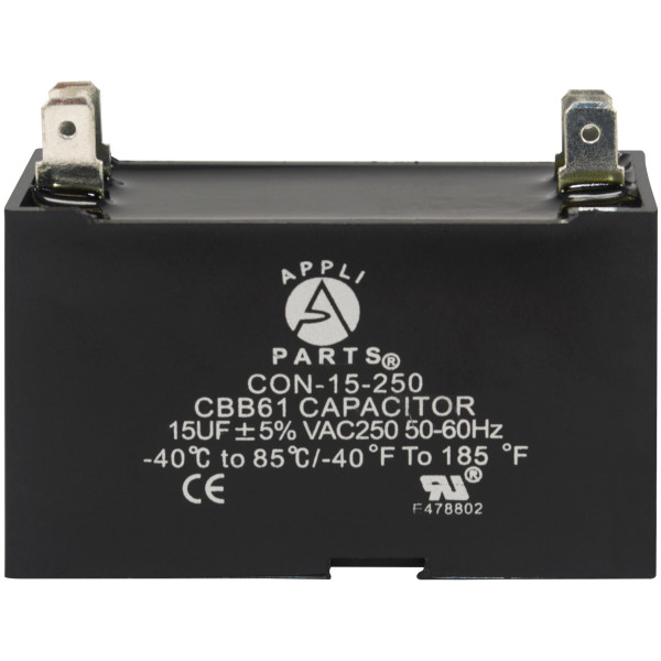Appli Parts CAP-15-250 Fan Capacitor 15 mfd (microfarads) uf 250 VAC with 4 Terminal Connections compatible with any brand within the same range of capacitance 2-1/4 Width, 7/8 Depth, 1-3/4 in Height