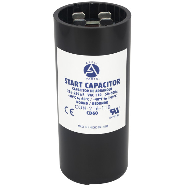 Appli Parts CON-216-110 Motor Start Capacitor 216-259 MFD uF, 110-125 VAC. Universal for Electric Motor Applications, 1.44 in Wide, 3.38 in Height