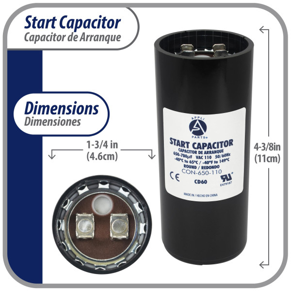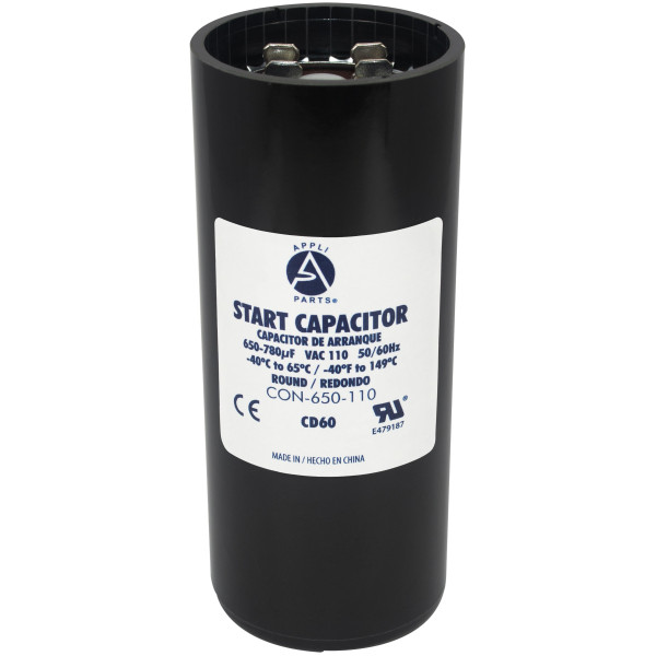 Appli Parts CON-650-110 Motor Start Capacitor 650-780 MFD uF, 110-125 VAC. Universal for Electric Motor Applications, 1.75 in Wide, 4.38 in Height