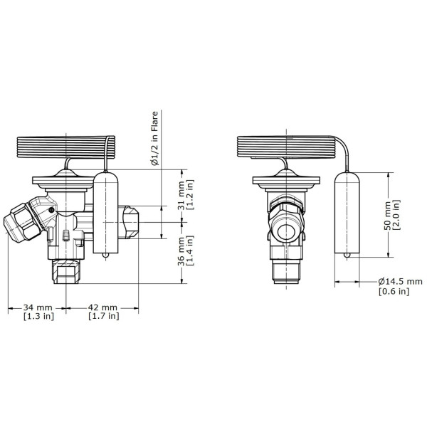 The 59 inch capillary transfers the sensing bulb temperature to the valve for accurate superheat regulation.