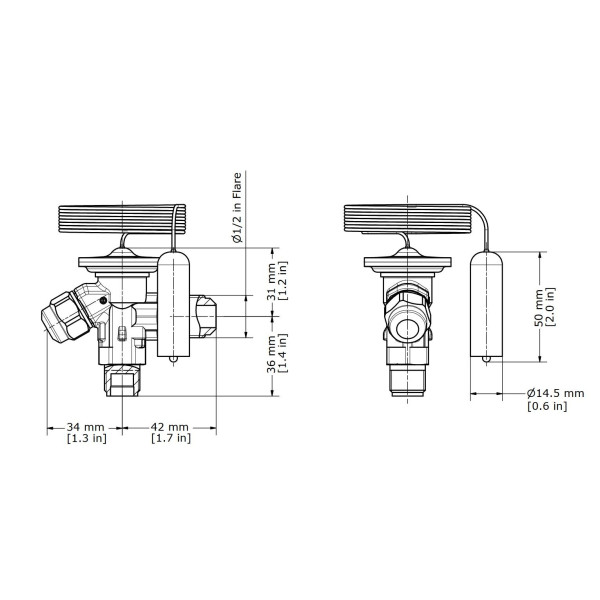 The 59 inch capillary transmits bulb temperature to the valve for responsive superheat control.