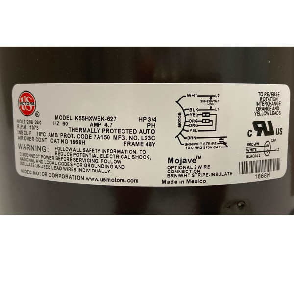 US Motors 1868H Mojave 3/4 Hp 1075 rpm, 6 poles, 1 shaft, TEAO, 1 speed, 5.6 diameter, CCW, Lead End, Reversible, 208-230 V, 60 hz, 1 ph, 10 mfd/370 VAC Run Capacitor K055WEK0627012B