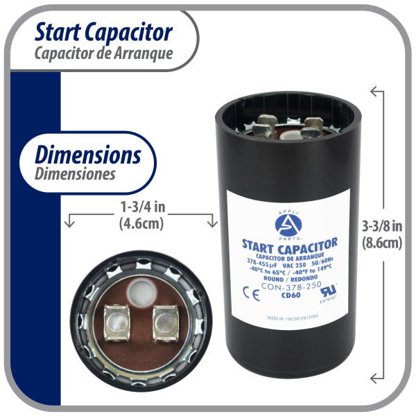 Appli Parts CON-378-250 Capacitor de Arranque 378-455 MFD (microfaradios) uF, 250 VAC. Universal para Motores Electricos, condensador de arranque de 4.6 cm de Diametro, 8.6 cm de Alto
