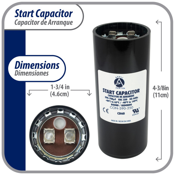 - Compatibilidad Universal: Funciona como reemplazo de cualquier marca con la misma capacidad en microfaradios y el mismo voltaje. Disenado para 250 VAC con terminales macho de 1/4 de pulgada. Reemplaza CAP-590-250