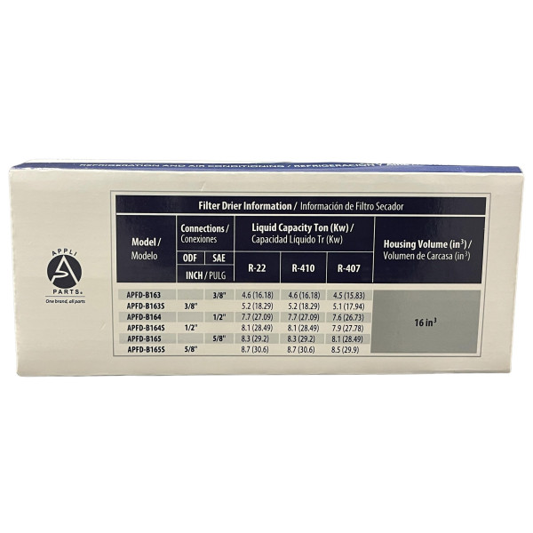 Appli Parts APFD-B163S Filtro Secador 3/8 pulg Bidireccional 163 ODF Soldable Universal para sistemas de Refrigeracion y Aire Acondicionado